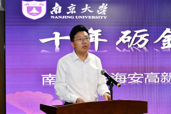 陆延青副校长发表讲话,他表示研究院十年建设符合吕建校长提出的“基础研究——创造技术——成果转化”的全链条创新理念,希望研究院在新环境下要有新的气象,新起点要有新的作为,继续发挥技术优势、平台优势、人才优势,做好科技创新成果转移转化,将更多领先科技和领军人才引进海安,抓住建设国家级高新区历史机遇,做到科研创新、人才培养和产业引领协同发展,构建海安与南京大学的创新共同体、发展共同体。希望研究院和地方政府以此活动为契机,在学科发展、人才培养、队伍建设、科学研究等领域,深入开展交流合作,积极探索协同创新机制,携手适应、支撑、引领新时代新发展,为推进高质量产学研平台、开放化自立自强科技创新体系贡献更大的智慧和力量。