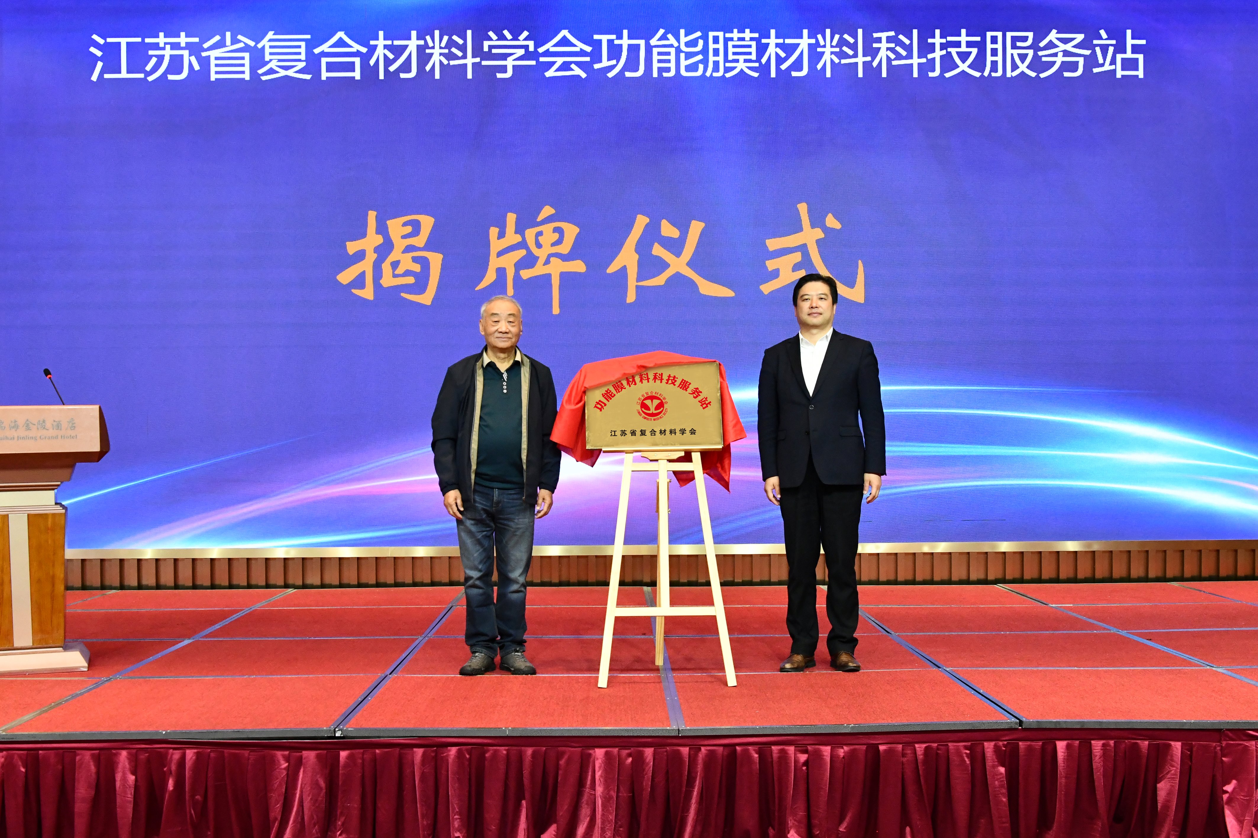 郝常委、杨副理事长共同为海安南京大学高新技术研究院揭牌,授予我院江苏省复合材料学会第一届功能膜专委会副主任委员单位。海安市科技局局长任镇和江苏省复合材料学会总工程师王珏上台为“江苏省复合材料学会功能膜材料科技服务站”揭牌。
